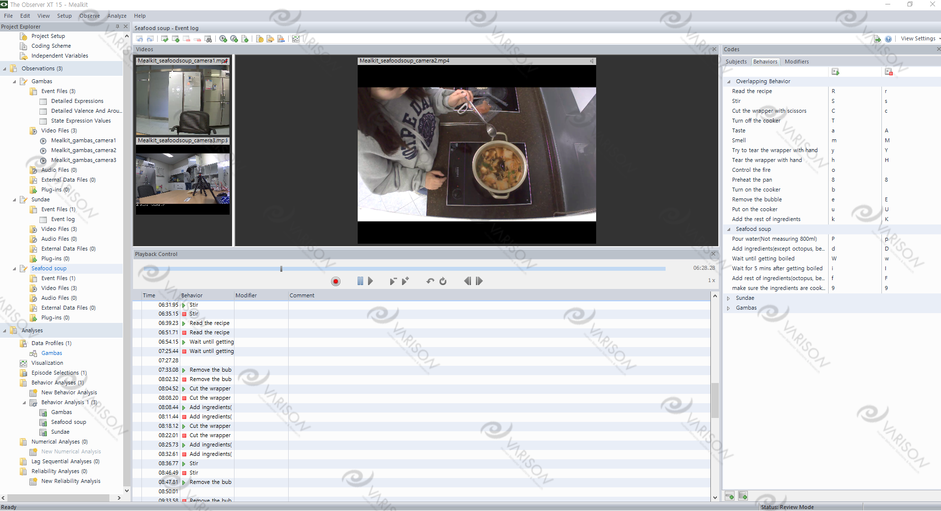 아래 동영상과 같이 3대의 IP 카메라로 레코딩 된 영상을 동시 재생하면서 밀키트 조리 과정에서 발생하는 필수 표적 행동과 그 외 추가적인 행동을 정의하고 부호화(코딩)하는 과정을 진행했습니다.