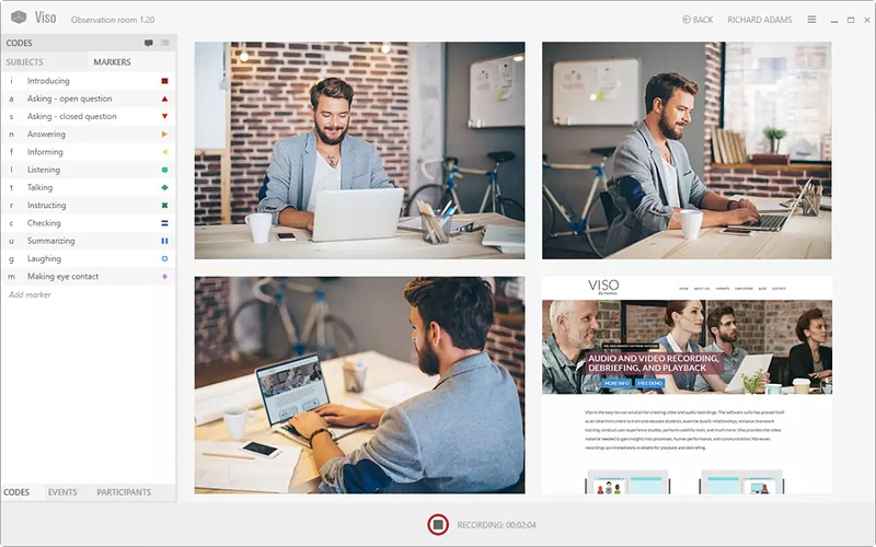 Viso는 오디오 & 비디오 레코딩 시스템으로 한 공간 및 여러 공간에서 발생하는 사람들의 행동 양상 혹은 상호 작용을 레코딩 하기 위한 솔루션입니다. 1개의 공간에 최대 4대까지의 IP 카메라를 연결할 수 있고, 이와 같은 공간의 개수는 제한 없이 세팅할 수 있으며 단순히 비디오 및 오디오 레코딩만 하는 것이 아닌 레코딩이 진행되는 동안, 특정 행동이 발생하는 시점에 마커(marker event) 및 주석(annotation)을 입력하여 마킹/주석된 지점을 선택 시, 해당 비디오(오디포 포함)를 즉시 재생하고 확인할 수 있는 것이 가장 큰 특징입니다.