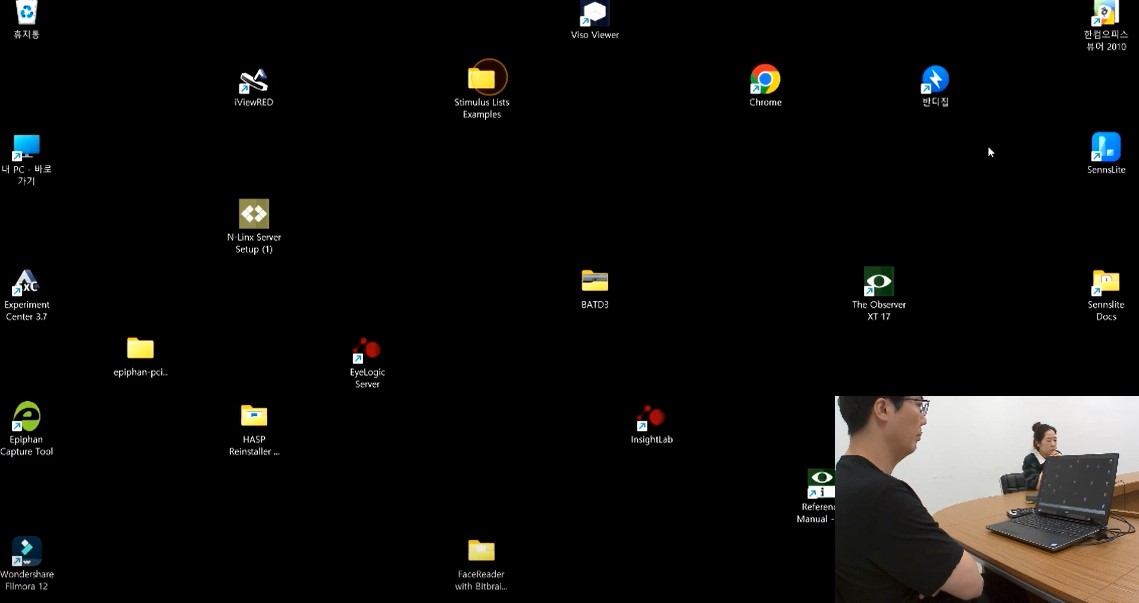화면 1에서 볼 수 있는 것처럼, 테스트 참가자는 안경 착용자로 캘리브레이션 개수를 5개 진행 후, Live Gaze 커서를 노트북 검정 스크린에 산재되어 있는 아이콘을 임의의 순서로 응시합니다.