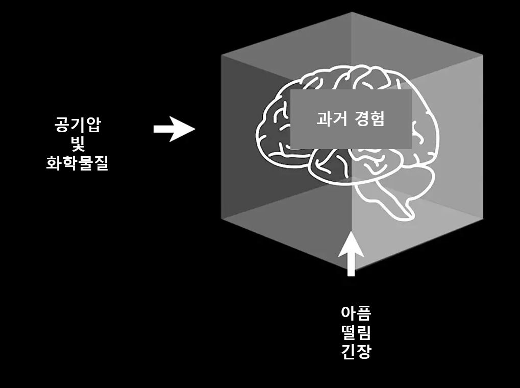 우리의 뇌가 현재와 과거의 정보를 사용하여 무슨 일이 일어나고 있는지를 이해하는 방법을 나타내는 그림입니다. 외부 세계의 정보는 감각(공기압, 빛, 화학물질)을 통해 유입되고 내부 세계의 정보(아픔, 떨림, 긴장)는 상호수용 네트워크를 통해 유입됩니다. 과거의 경험은 뇌에 저장됩니다.