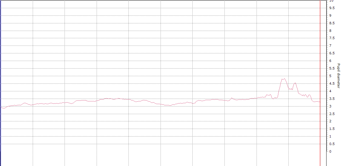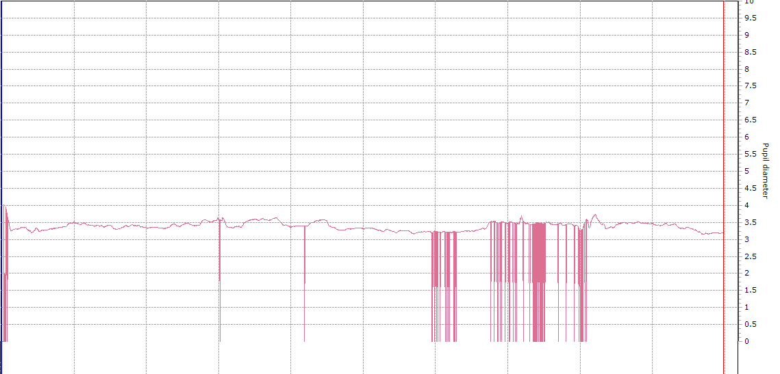 그렇다면 앞서 기술했던 LogicOne에서도 시선 데이터의 단절없이 제대로 기록이 될까요? Pupil diameter 데이터를 사용하여 시간에 따른 Pupil diameter를 그래프 처리함으로써 확인해 보겠습니다.