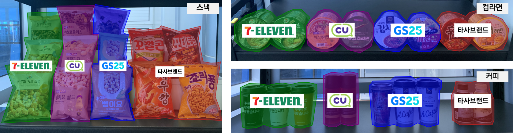각 제품군(스낵, 컵라면, 커피) 모두 왼쪽에서부터 '7-Eleven', 'CU', 'GS25', '일반브랜드' 순서로 배치하였습니다.