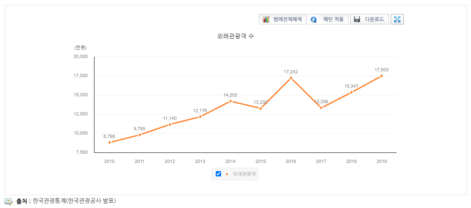 한국관광공사가 발표한 외래관광객 수(한국을 방문하는 외국인 수) 통계에 의하면 우리나라를 방문하는 외래관광객은 2015년, 2017년도에 잠시 주춤한 것을 제외하고 2010년 부터 꾸준히 증가하고 있습니다. 이러한 수요에 맞추어 인천공항 내에서는 공항 내 시설 정보와 위치, 길안내 정보를 제공하는 키오스크를 공항 곳곳에 비치하여 외래관광객들에게 편의를 제공하고 있습니다.